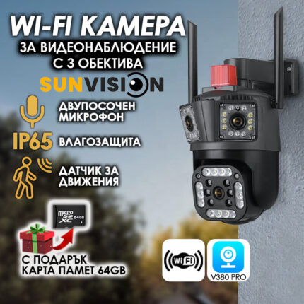 Wi-Fi камера SUNVISION за видеонаблюдение с 3 обектива 16MP V380 Pro + карта памет 64GB