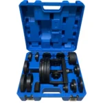 Комплектът включва разнообразни притискащи плочи с различни размери, което позволява работа с лагери с различни диаметри. Благодарение на центриращото устройство, винтът винаги е позициониран правилно, осигурявайки прецизност и стабилност при работа.