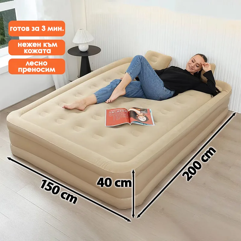 Превърнете всяко помещение в комфортна спалня с нашето луксозно надуваемо легло! Изработено от висококачествени материали и с удобна височина от 40 см, това легло предлага удобство, стабилност и бърз монтаж. Перфектно е за гости, къмпинг, пътувания или ежедневна употреба.