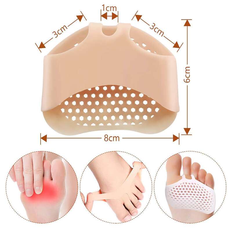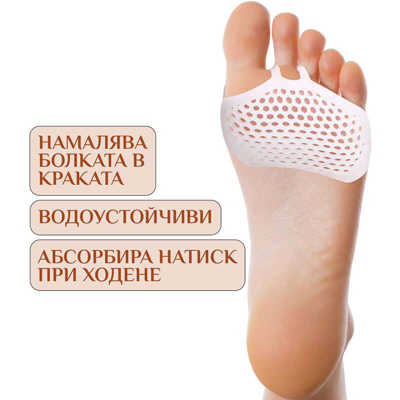 Силиконовите подложки за стъпала разпределят натиска на предната част на стъпалото за облекчаване на болката. Дизайнът с разделени пръсти предотвратява притискането на пръстите един към друг. Изработен от дишаща силиконова материя. Подложките за стъпала абсорбират влагата, премахват миризмите и потта.