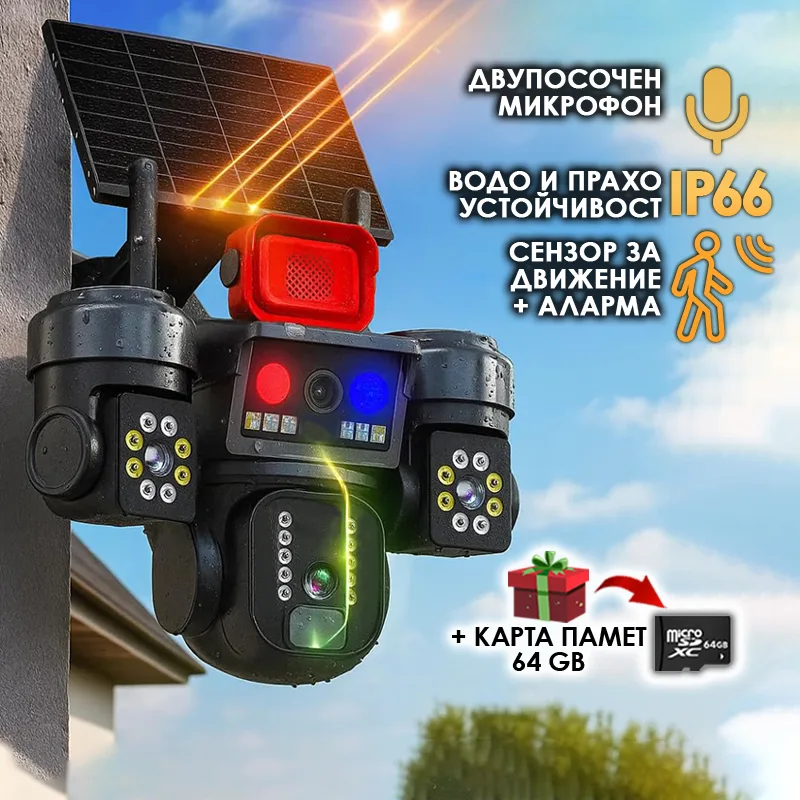 Соларна камера с 3 обектива SUNVISION 16MP Wi-Fi/SIM карта + 64GB карта памет