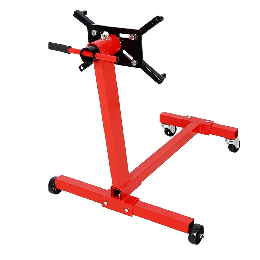 Благодарение на 360-градусовата въртяща се глава можете да позиционирате двигателя точно както ви е удобно, а регулируемите монтажни рамена позволяват работа с различни типове агрегати. Лесното придвижване и заключване чрез четири стабилни колела гарантира безопасност и мобилност дори в натоварен сервиз.